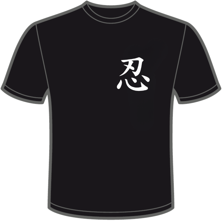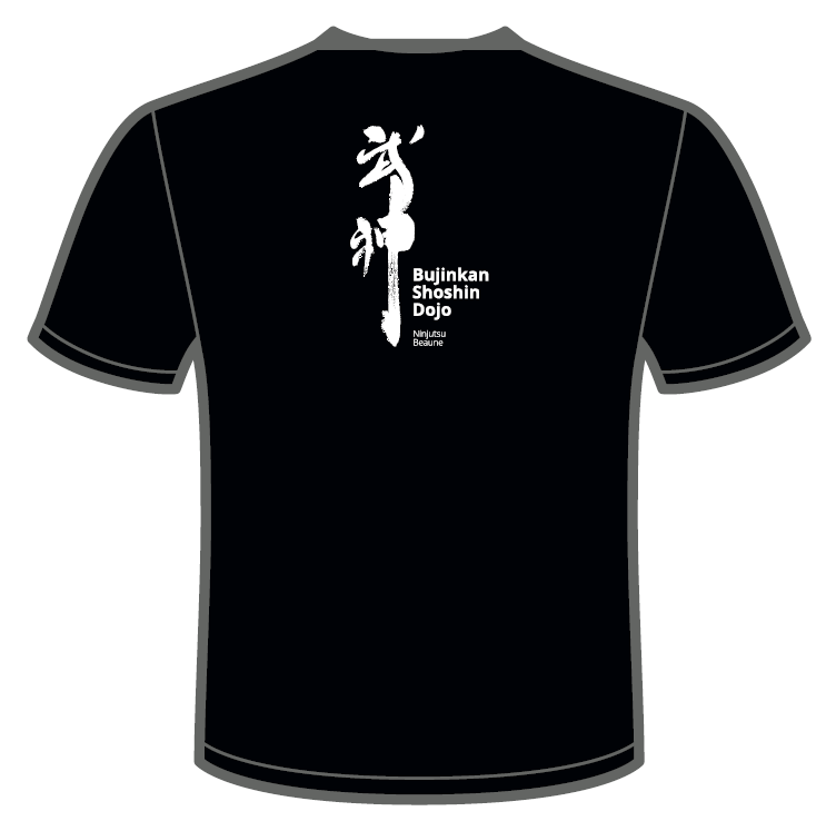 Dos : c’est le logo de notre Dôjô, issu d’une calligraphie de Hatsumi Masaaki Soke réalisée au Honbu Dojo en juillet 2019 (la calligraphie complète indique « Bujinkan Dôjô », ici il n’y a que les deux premiers Kanji : « Bu-Jin », qui sont généralement utilisés comme logo au sein des organisations du Bujinkan)
